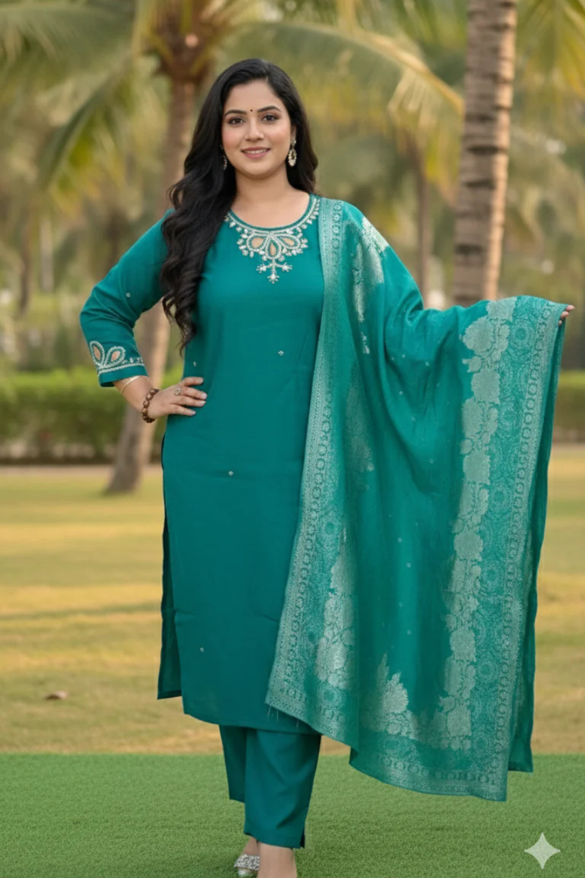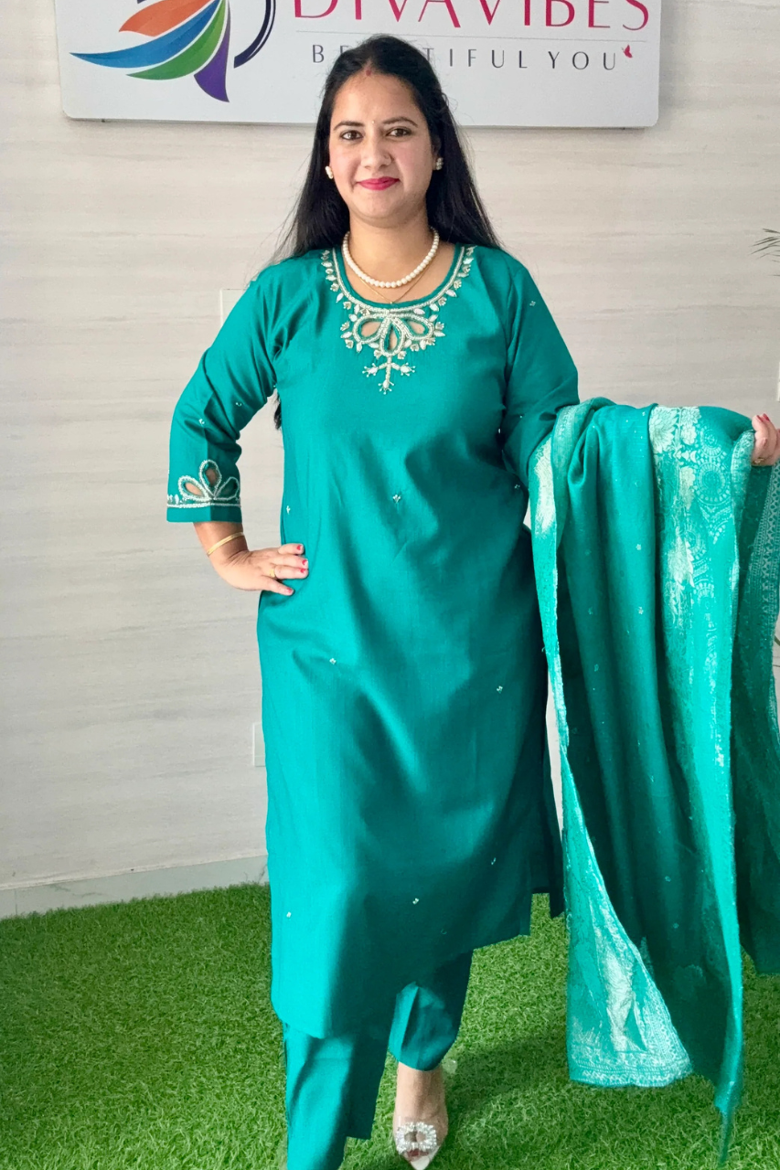 Step into timeless elegance with this beautifully crafted teal kurta set. Made from premium fabric, the kurta features intricate embroidery around the neckline and sleeves, paired with a matching straight pant for a refined silhouette. The look is completed with a delicately woven duppatta, adding a graceful touch perfect for festive gatherings, family celebrations, or special evenings.